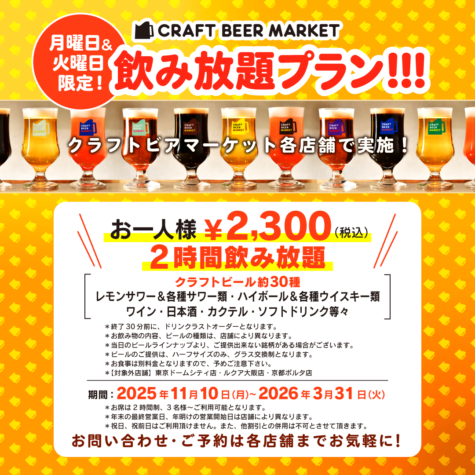 【お知らせ!】月・火限定!とってもお得な¥2,300飲み放題コース!